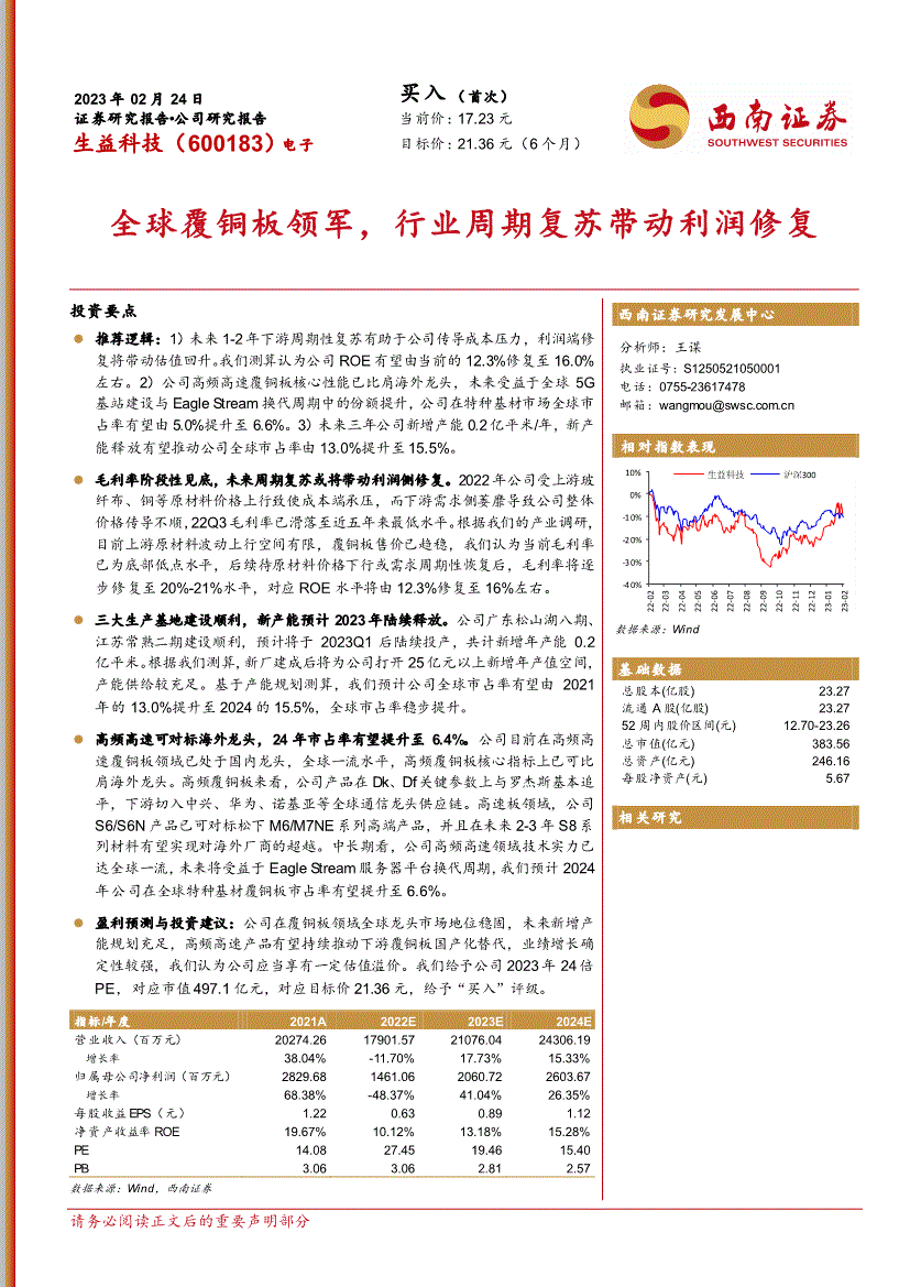 2023年02月24日 证券研究报告公司研究报告买入(首次) 当前价:17.23元生益科技(600183)电子 目标价:21=.36元(6个月) 全球覆铜板领军,行业周期复苏带动利润修复投资要点西南证券研究发展中心 分析师:王谋执业证号:S01 电话 邮箱…:相对指数表现数据来源◆:Wind 基础数据 总股本(亿股) 23.27 流通A股(亿股) 23.27 52周内股价区间(元) 12.70-23.26 总市值(亿元) 383▽.56 总资产(亿元) 246.16 每股净资产(元) 5.67 相关研究 推荐逻辑★▽:1)未来1-2年下游周期性复苏有助于公司传导成本压力,利润端修复将带动估值回升。