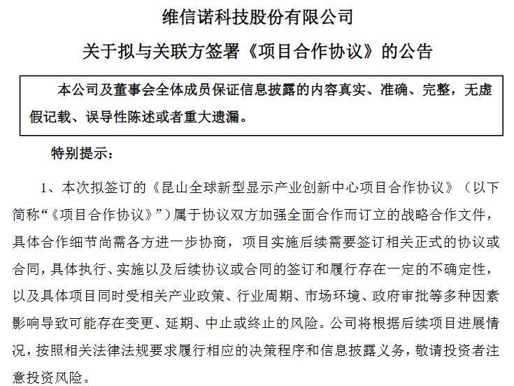 4月24日,维信诺科技股份有限公司发布公告称,为加快推动昆山新一代电子信息产业集群高质量发展,维信诺科技股份有限公司与昆山经济技术开发区管理委员会本着平等互利、优势互补的原则,经过充分友好协商,就在昆山开发区投资设立昆山全球新型显示产业创新中心项目,拟签署《昆山全球新型显示产业创新中心项目合作协议》,项目投资总额预计约人民币50亿元。