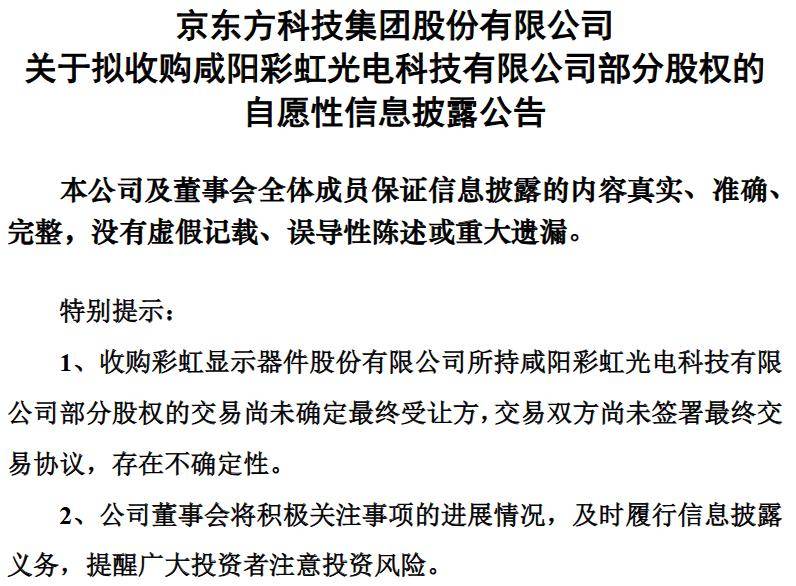6月17日,BOE(京东方)发布公告称,彩虹显示器件股份有限公司拟出售所持咸阳彩虹光电科技有限公司30%股权。京东方科技集团股份有限公司根据公司发展战略,为紧抓产业格局整合演进机遇,进一步提升公司竞争力,拟收购上述30%股权。