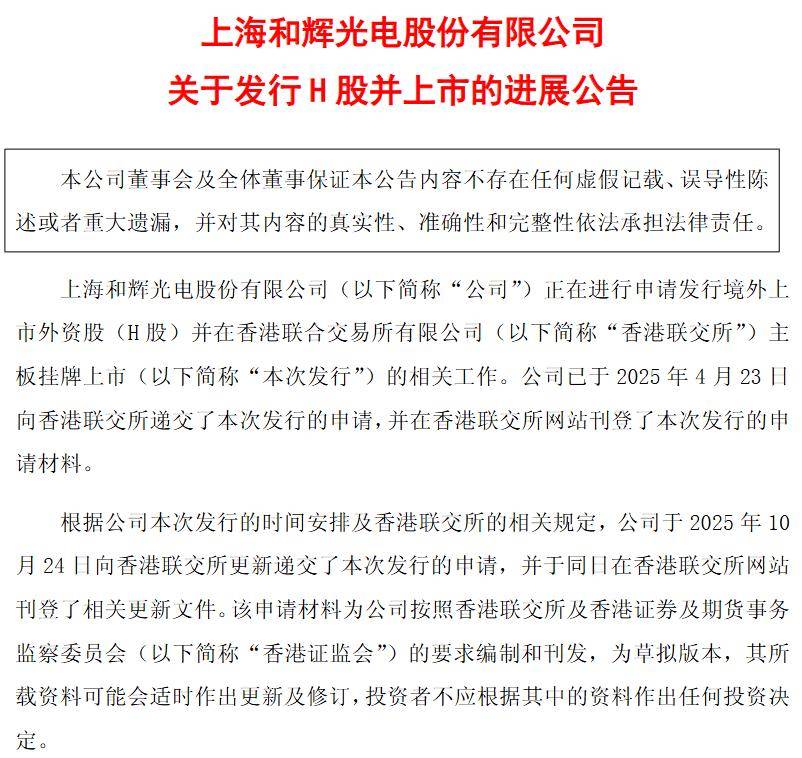 2月22日,和辉光电发布公告称,公司董事会审议通过了《关于公司发行H股股票并在香港联合交易所有限公司上市的议案》《关于公司发行H股股票并在香港联合交易所有限公司上市方案的议案》等议案,拟赴港股上市。4月23日,和辉光电向港交所递交了IPO申请。10月24日,和辉光电向香港联交所更新递交了本次发行的申请,并于同日在香港联交所网站刊登了相关更新文件。